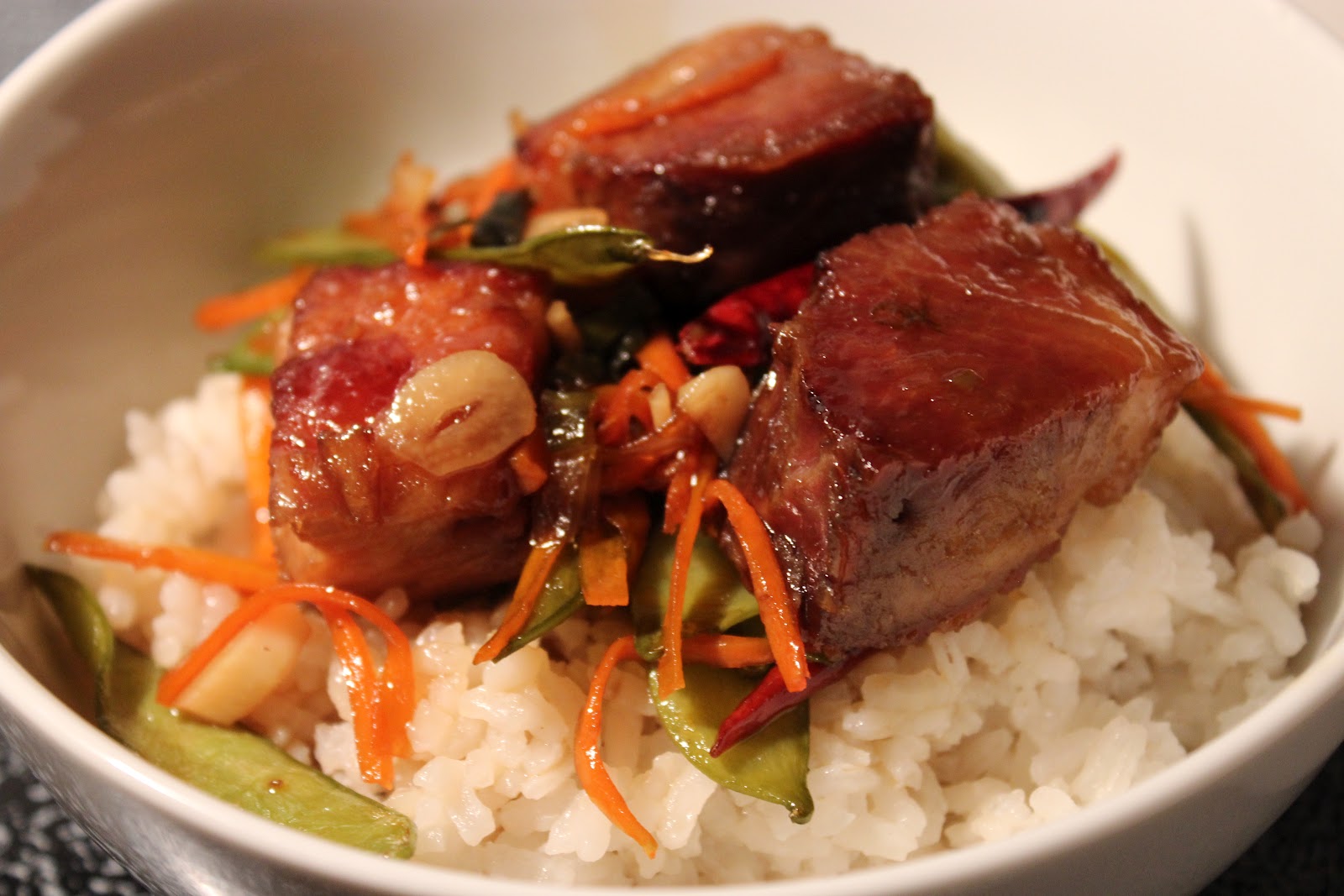 fat. You'll have a couple minutes so it's a good time to mix the sauce. Cook the pieces on each side until golden brown. When browned, soak up some of the fat with a paper towel and tongs. Turn the heat to medium high and add a few tablespoons of the sauce. Keep turning the pork so all sides get nice and caramelized. Next, make some room in the middle of the pan and add the garlic, chilies, carrot, pea pods and green onion and saute for a minute. Add the remaining sauce and water. Cook for a few more minutes so that the sauce thickens up and done. Serve over rice or asian noodles.